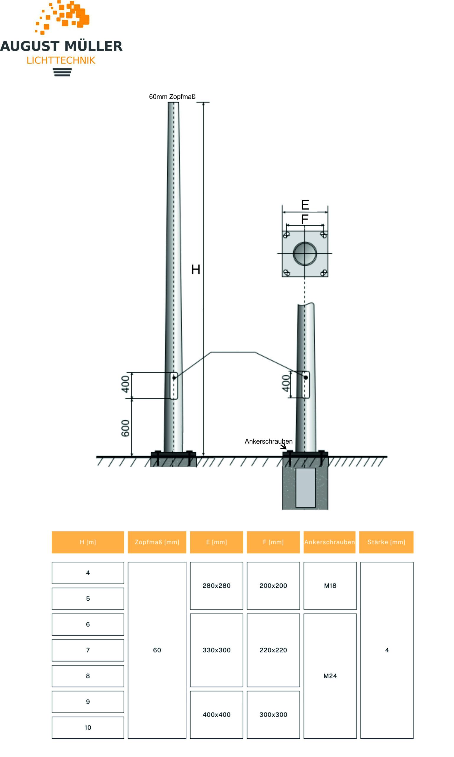 - Lichtmast in verschiedenen Höhen: Verfügbar in Höhen von 4 bis 10 Metern (sichtbare Masthöhe zzgl. Fundamentsockel).